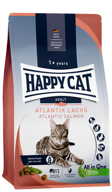 Lightweight and with an extended shelf life, this food remains enticing even after sitting in the bowl for hours and significantly contributes to dental hygiene. As a premium cat food, Culinary Adult Atlantik-Lachs dry has numerous advantages. However, even when providing your furry companion with top-quality nutrition, it is not advisable to feed dry food exclusively. Cats often do not drink enough water, which can lead to health issues. Therefore, ensure your cat is getting sufficient hydration, or complement Culinary Adult Atlantik-Lachs with portions of wet food in her daily meals. Our Happy Cat line offers a variety of delicious wet food options that will help guarantee that cats meet their hydration needs through their diet.