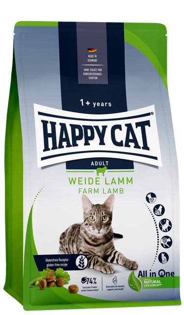We craft our premium Happy Cat dry food using only the finest ingredients and a particularly gentle production method. Happy Cat’s scientifically backed All in One concept, featuring a unique blend of active components, supports the five key aspects of feline health. This formula enhances the immune system, promotes heart health, and aids in urinary tract and digestive functions. The natural omega 3 and 6 fatty acids in our Culinary Adult Farm Lamb also contribute to maintaining healthy skin and a shiny coat.