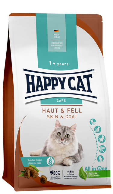 The salmon included in Happy Cat Care Skin & Coat ensures a rich source of omega 6 and omega 3 fatty acids. This well-balanced formula also features easily digestible chicken, nutrient-dense linseed, birch, and rosemary.During specific times, it can be beneficial to provide additional support with skin-nourishing nutrients. In the chilly winter months, when dry, heated air can stress your cat's coat, offering Happy Cat Care Skin & Coat is advisable. The same holds true in spring and autumn when your cat requires ample skin-nourishing nutrients like vitamins A and B, biotin, and zinc during shedding periods.