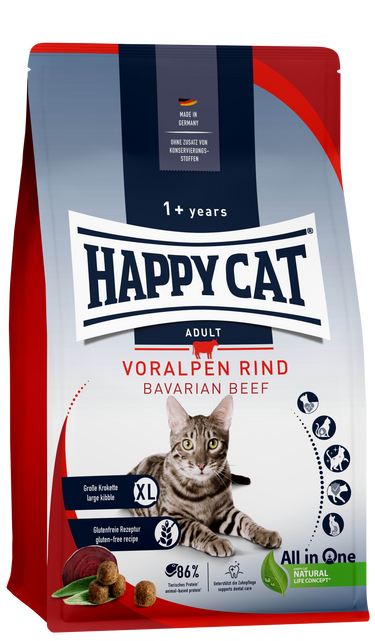 Both dry cat food and wet food have their unique advantages. Together, they provide your cat with the ultimate all-around nutrition. During the day, your cat can nibble on small portions from a bowl filled with Happy Cat Culinary Voralpen-Rind or another dry treat. This aligns with her natural eating habits. You can also help your indoor cat maintain healthy hydration with the wet food options available from Happy Cat.