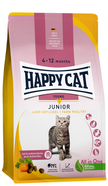 Junior food can be introduced as early as 4 months of age, coinciding with your kitten's second growth phase, where weight gain begins to stabilize. To smoothly transition from kitten food to junior food, it's advisable to do so gradually to avoid upsetting your kitten's stomach. You can mix the junior food with the kitten food over a span of eight to ten days, gradually increasing the amount each day. This gentle approach allows your sensitive kitten to adapt to the new diet without any issues. With Happy Cat Junior Country Poultry, you can fulfill the nutritional needs of your young cat while establishing a solid foundation for a healthy life. The kibbles in our Junior dry food are still small (approximately 4 x 7 mm), but slightly larger than the very tiny kibbles (about 4 x 5 mm) found in kitten food.Once your kitten reaches one year old, you can transition to adult food.