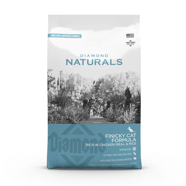 Diamond Naturals cat food is crafted with natural ingredients, featuring premium cage-free chicken, an assortment of superfoods, and fresh fruits and vegetables. This formula is not only tasty but also ensures that both cats and kittens receive balanced and complete nutrition. Designed for picky eaters, the Diamond Naturals finicky cat formula is abundant in taurine, DHA, vitamins, and a variety of essential nutrients, promoting healthy and joyful growth in cats of all ages. This flavorful recipe is particularly ideal for those cats with selective tastes and can be a long-term dietary staple. Furthermore, it offers a high level of protein and fat to provide ample energy for active felines. Ingredients Chicken meal (59%), ground white rice (23%), chicken fat (preserved with mixed tocopherols), natural flavor, linseed, powdered cellulose, salmon oil (a source of DHA), potassium chloride, dried chicory roots, kale, chia seeds, pumpkin, blueberries, oranges, quinoa, dried kelp, coconut, spinach, carrots, papaya, Yucca schidigera juice. Guaranteed Analysis Crude Protein 40% Crude Fat 20% Crude Fiber 3% Crude Ash 8.5% Moisture 10.0% Calcium 2.1% Phosphorus 1.6 Sodium 0.45% Magnesium 0.1% DHA 0.05% Omega-6 fatty acids: 3% Omega-3 fatty acids: 0.6% Additives: Vitamins: Vitamin A 10,000 IU/kg Vitamin B1 35 mg/kg Vitamin B2 10 mg/kg Vitamin B6 10 mg/kg Vitamin B12 0.07 mg/kg Vitamin D3 1,000 IU/kg Vitamin E 150 IU/kg Biotin 0.25 mg/kg Calcium D-pantothenate 20 mg/kg Choline chloride 3,500 mg/kg Folic acid 2 mg/kg Niacin 135 mg/kg Taurine 1,200 mg/kg Amino acids: DL-methionine 2,000 mg/kg Trace Elements: Copper (as copper(II) chelate of amino acids hydrate) 10 mg/kg Copper (as copper(II) sulphate pentahydrate) 10 mg/kg Iodine (as potassium iodide) 2.5 mg/kg Iron (as iron(II) chelate of amino acids hydrate) 100 mg/kg Iron (as iron(II) sulphate monohydrate) 100 mg/kg Manganese (as manganous sulphate monohydrate) 8 mg/kg Manganese (as manganese chelate of amino acids hydrate) 8 mg/kg Selenium (as sodium selenite) 0.6 mg/kg Zinc (as zinc chelate of amino acids hydrate) 75 mg/kg Zinc (as zinc sulphate, monohydrate) 75 mg/kg Technological additives: sodium bisulphate 8000 mg/kg Keep in a dry environment. Serve dry, and ensure fresh water is available at all times. Feeding Guide Weight Up to 4 months 4-8 months 9-12 months Adult 0.5kg 27g – – – 1.75kg 68g 55g – – 2.25kg – – – 40g 2.75kg 96g 77g 61g – 4kg – 102g 81g – 4.5kg – – – 67g 5.5kg – – 103g – 6.8kg – – – 91g 9kg – – – 112g