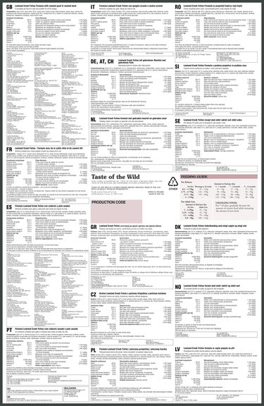 This recipe combines cage-free quail and cage-free duck, both of which are easily digestible proteins, making it a perfect choice for cats who love poultry. It's a grain-free cat food suitable for all life stages and includes species-specific probiotics to support digestion and immunity; taurine for heart and eye health; and antioxidants derived from vegetables, legumes, and fruits to promote overall wellness, just as nature intended. Ingredients Duck, duck meal, turkey meal, chicken meal, sweet potatoes, lentils, peas, chicken fat (preserved with mixed tocopherols), roasted quail, roasted duck, natural flavor, salmon oil, DL-methionine, salt, potassium chloride, choline chloride, taurine, blueberries, raspberries, tomatoes, dried chicory root, dried Lactobacillus plantarum fermentation product, dried Bacillus subtilis fermentation product, dried Lactobacillus acidophilus fermentation product, dried Enterococcus faecium fermentation product, dried Bifidobacterium animalis fermentation product, zinc proteinate, vitamin E supplement, niacin, manganese proteinate, copper proteinate, zinc sulfate, manganese sulfate, copper sulfate, thiamine mononitrate (source of vitamin B1), vitamin A supplement, biotin, potassium iodide, calcium pantothenate, riboflavin (vitamin B2), pyridoxine hydrochloride (source of vitamin B6), vitamin B12 supplement, manganous oxide, sodium selenite, vitamin D supplement, folic acid. Includes a source of live (viable), naturally occurring microorganisms. Guaranteed Analysis *Not recognized as an essential nutrient by the AAFCO Cat Food Nutrient Profiles. Calorie Content 3,558 kcal/kg (383 kcal/cup) Calculated Metabolizable Energy Feeding Guide For pregnant or nursing cats, we suggest allowing free access to food. Individual cats may need more or less than the recommended amounts based on their activity levels and other factors. AAFCO Statement Taste of the Wild Lowland Creek Feline Recipe is designed to satisfy the nutritional standards set by the AAFCO Cat Food Nutrient Profiles for all life stages.
