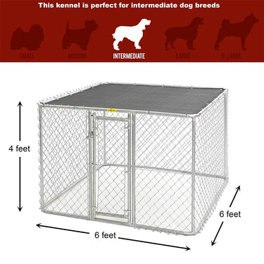 Dimensions: 6L x 6W x 4H Feet Weight: 82 lbs Spacious dog kennel – This medium chain link kennel provides ample space for your dog to exercise and play outdoors | Each kennel measures 6L x 6W x 4H feet, weighs 82 pounds, and is perfect for medium to large dogs Sturdy outdoor dog kennel – Constructed with a robust galvanized steel frame and chain-link mesh, this kennel guarantees enhanced stability for years of reliable use with minimal maintenance Complimentary sunscreen for outdoor protection – The large dog kennel comes with a free protective woven polyethylene fabric sunscreen that offers 80% sun protection Easy, secure & reliable – The full entry door allows for convenient access, while a secure latch keeps your dog safely contained within the kennel
