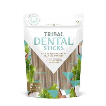 Introduction:Promote your dog's dental health with Tribal Dental Sticks, specially formulated for dogs weighing up to 15kg. Enriched with PhytoDent™, an exclusive seaweed blend endorsed by veterinarians, these dental sticks help keep teeth and gums in great shape while ensuring fresh breath.Product Features:• PhytoDent™ Seaweed Complex: Aids in maintaining healthy gums and minimizing plaque build-up.• Vegan and Grain-Free: Ideal for all dogs, including those with dietary restrictions.• Natural Ingredients: Crafted without added sugars or artificial additives.• Low in Fat: Supports your dog’s health while promoting oral hygiene.• Enhanced Flavor: Contains coconut oil for taste and peppermint for refreshing breath.Technical Details/Specifications:• Dog Size: Suitable for dogs up to 15kg• Usage: 1 stick daily for optimal results• Duration: Noticeable improvements within 4 weeks• Key Ingredients: PhytoDent™ Seaweed Complex, coconut oil, peppermint• Sustainability: Made using sustainably sourced seaweed from IrelandInstructions:Administer 1 dental stick daily, ideally after the final meal of the day. Suitable for dogs aged 6 months and up. Always ensure fresh water is available and store in a cool, dry location.