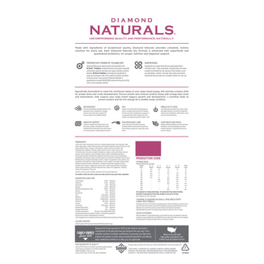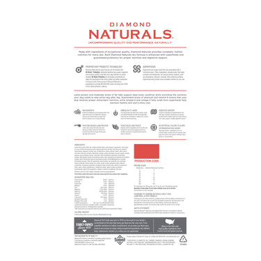 Ingredients Lamb, lamb meal, white rice flour, cracked pearled barley, grain sorghum, egg product, dried yeast, chicken fat (stabilized with mixed tocopherols), oatmeal, dried beet pulp, natural flavor, flaxseed, DL-Methionine, potassium chloride, salt, choline chloride, taurine, dried chicory root, L-Carnitine, kale, chia seed, pumpkin, blueberries, oranges, quinoa, dried kelp, coconut, spinach, carrots, papaya, yucca schidigera extract, dried Lactobacillus plantarum fermentation product, dried Bacillus subtilis fermentation product, dried Lactobacillus acidophilus fermentation product, dried Enterococcus faecium fermentation product, dried Bifidobacterium animalis fermentation product, vitamin E supplement, beta carotene, iron proteinate, zinc proteinate, copper proteinate, ferrous sulfate, zinc sulfate, manganese sulfate, copper sulfate, potassium iodide, thiamine mononitrate, manganese proteinate, ascorbic acid, vitamin A supplement, biotin, niacin, calcium pantothenate, sodium selenite, pyridoxine hydrochloride, vitamin B12 supplement, riboflavin, vitamin D3 supplement, folic acid. Includes a source of live (viable), naturally occurring microorganisms. This facility also produces food that may have other ingredients. Guaranteed Analysis Crude Protein 25.0% Minimum Crude Fat 15.0% Minimum Crude Fiber 3.0% Maximum Moisture 10.0% Maximum Zinc 150 mg/kg Minimum Selenium 0.35 mg/kg Minimum Vitamin A 15,000 IU/kg Minimum Vitamin E 150 IU/kg Minimum Taurine* 0.12% Minimum L-Carnitine* 300 mg/kg Minimum Omega-6 Fatty Acids* 2.4% Minimum Omega-3 Fatty Acids* 0.4% Minimum Total Microorganisms* (Lactobacillus plantarum, Bacillus subtilis, Lactobacillus acidophilus, Enterococcus faecium, Bifidobacterium animalis) Not Less Than 80,000,000 CFU/lb *Not acknowledged as an essential nutrient by the AAFCO Dog Food Nutrient Profiles. Calorie Content 3,650 kcal/kg (414 kcal/cup) Calculated Metabolizable Energy Feeding Guide Weight (lbs.) Standard Measuring Cups/Day 3 ⅓ 5 ½ 10 ¾ 20 1⅓ 30 2 40 2⅓ This feeding guide serves as a baseline for the daily food quantity for your dog. It is advisable to maintain your dog in optimal body condition and to avoid overfeeding. The quantity of food your dog requires may vary depending on age, activity levels, or other foods and treats given, so consult your veterinarian to determine the right weight for your dog and to make any necessary adjustments to their diet. Always ensure that fresh water is accessible to your pet at all times. AAFCO Statement Diamond Naturals Small Breed Adult Dog Lamb & Rice Formula is crafted to fulfill the nutritional standards set by the AAFCO Dog Food Nutrient Profiles for maintenance.