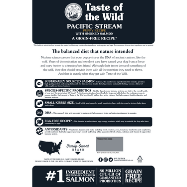 With unique tastes derived from smoked salmon, vegetables, legumes, and fruits in a petite kibble size, this formula ensures that puppies receive the essential nutrients for their overall health and vitality. The guaranteed DHA levels and well-balanced nutrition make this recipe suitable for pregnant or nursing mothers, as well as other adult dogs. Ingredients Salmon, ocean fish meal, sweet potatoes, peas, potatoes, canola oil, pea protein, tomato pomace, smoked salmon, salmon meal, natural flavor, salmon oil (a source of DHA), salt, choline chloride, taurine, dried chicory root, yucca schidigera extract, tomatoes, blueberries, raspberries, dried Lactobacillus plantarum fermentation product, dried Bacillus subtilis fermentation product, dried Lactobacillus acidophilus fermentation product, dried Enterococcus faecium fermentation product, dried Bifidobacterium animalis fermentation product, vitamin E supplement, iron proteinate, zinc proteinate, copper proteinate, ferrous sulfate, zinc sulfate, copper sulfate, potassium iodide, thiamine mononitrate (vitamin B1), manganese proteinate, manganous oxide, ascorbic acid, vitamin A supplement, biotin, niacin, calcium pantothenate, manganese sulfate, sodium selenite, pyridoxine hydrochloride (vitamin B6), vitamin B12 supplement, riboflavin (vitamin B2), vitamin D supplement, folic acid. Includes a source of live (viable), naturally occurring microorganisms. Guaranteed Analysis *Not regarded as an essential nutrient by the AAFCO Dog Food Nutrient Profiles. Calorie Content 3,600 kcal/kg (360 kcal/cup) Calculated Metabolizable Energy Feeding Guide For adult dogs weighing over 100 pounds, increase by ½ cup for every additional 10 pounds. We recommend free-choice feeding for pregnant or nursing adult dogs. Individual dogs may need more or less food than indicated based on their activity level and other factors. AAFCO Statement The Taste of the Wild Pacific Stream Puppy Recipe is designed to satisfy the nutritional requirements outlined by the AAFCO Dog Food Nutrient Profiles for all life stages, including the growth of larger breed dogs (70 lbs. or more as adults).