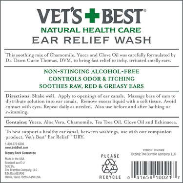Description Vet’s Best Dog Ear Relief Wash (4 oz) effectively cleans and comforts raw, irritated, itchy, and foul-smelling dog ears. This ear wash utilizes a unique blend of natural ingredients (chamomile, yucca, and clove oil) specifically formulated to address odor, itching, and discomfort. The formula is free from alcohol and is gentle on the skin. Key Benefits Facilitates easy cleaning and soothing of raw, itchy, smelly, or greasy dog ears Incorporates a distinctive blend of natural ingredients such as yucca, clove oil, and echinacea to help manage odor and itching Alcohol-free and non-stinging formula that can be applied daily or as required For optimal ear canal health between baths, use alongside Vet’s Best Dry Ear Relief powder This two-step system effectively cleans and dries ears to alleviate itching and irritation Precautions Keep away from eyes. Not suitable for use on cats or nursing/pregnant dogs. Ingredients Witch Hazel, Chamomile, Yucca, Clove Oil, Tea Tree Oil, and Echinacea.