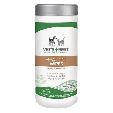 When fleas and ticks invade your home and affect your pet, Vet’s Best Dog Flea + Tick Dog & Cat Wipes provide a powerful defense with a special mix of certified natural essential oils and plant-derived ingredients. Peppermint oil and clove extract (eugenol) effectively kill fleas, their eggs, and ticks on contact, while also repelling mosquitoes! These wipes contain no chemical pyrethrins, permethrins, or cedar oil, ensuring safety for your entire family. The non-staining formula is perfect for various surfaces in your home such as countertops, baseboards, pet bedding, and collars, making it versatile for all your needs. Safe for pets aged 12 weeks and older. Key Benefits Gently yet effectively eliminates fleas, flea eggs, and ticks on contact, while also keeping mosquitoes at bay; leaves a clean, fresh scent without any added fragrances. Utilizes certified natural essential oils like peppermint oil and clove extract to manage and eliminate parasitic pests. The non-staining formula is ideal for use on countertops, baseboards, pet bedding, and collars; these durable yet gentle wipes are free from plastic resins. Plant-based formulation contains no pyrethrins or harsh chemicals; easy to apply and safe around pets and humans. Proudly manufactured in the USA using premium plant-based ingredients and certified natural essential oils. Precautions May cause moderate eye irritation. Be sure to wash hands thoroughly with soap and water after using. For external application only. Prolonged or frequent skin contact may lead to allergic reactions in some individuals. Some pets may show sensitivity after using any product. If sensitivity is observed, wash your pet with a mild soap and rinse thoroughly with plenty of water. If symptoms persist, consult your veterinarian immediately. Not recommended for use on pregnant or nursing pets. Important Information Fleas will rise to the surface of your pet's coat as they die, so if you notice an increase in fleas initially, consider it a sign of effectiveness. If fleas are still visible after application, your pet may have acquired new fleas from their environment, which can include other pets, surfaces, and outdoor spaces. It can take up to 30 days to disrupt the complete flea life cycle. Additionally, treat areas that could harbor new fleas (like carpets, yards, etc.) to ensure full flea control. Ingredients Peppermint Oil 0.30%, Eugenol (Clove Extract) 0.70%, Sodium Lauryl Sulfate 2.70%, Inert Ingredients (Water and Sodium Benzoate) 96.30% Please read the entire label before each use and follow the instructions carefully. Keep securely closed when not in use. Before first use: Remove the lid to pull out a wipe from the center of the roll. Replace the lid and thread the wipe through the hole. Always close the lid after use to maintain moisture. For Dogs and Cats 12 Weeks or Older: Wipe the pet’s coat until it is damp, avoiding the eyes, mouth, and genitals. For optimal results, part the coat and apply the product directly to the skin. Massage the coat so the product penetrates to the skin. Ensure to cover the entire coat, including paws, legs, tail, and stomach. Allow the coat to dry completely before letting pets groom themselves or each other. Repeat if necessary, allowing 2-4 hours between applications, not exceeding twice in 24 hours. Pets can be treated indoors or outdoors. For Hard Surfaces, Base Boards, Pet Bedding, or Collars: This product is designed to be non-staining when used as directed; however, always test a small amount on an inconspicuous area for colorfastness before applying. Wipe surfaces evenly, leaving a light film behind. Avoid over-saturating. Dispose of the wipe immediately after use. Not recommended for fine furniture.
