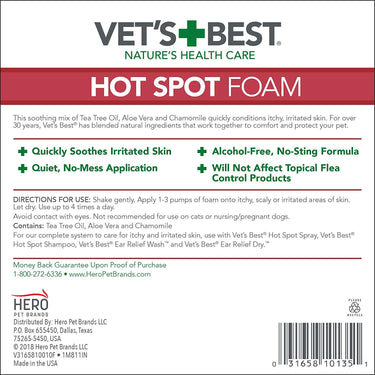 Vet’s Best Hot Spot Foam offers instant relief and effectively calms itchy, dry, and irritated skin on dogs A natural solution for swiftly alleviating your dog’s itching and scratching Vet’s Best Hot Spot Foam (4 oz) delivers prompt relief and quickly calms itchy, dry, and irritated dog skin. This foam features a mess-free application and utilizes a special blend of natural elements (tea tree oil, aloe vera, and chamomile) to provide rapid relief from your dog’s discomfort. It is alcohol-free and has a no-sting formula, ensuring it won’t interfere with topical flea and tick treatments. Alcohol-free and no-sting formula Simple to apply, can be used up to 4 times daily Instructions Shake gently. Dispense 1-3 pumps of foam onto the affected itchy, scaly, or irritated skin areas. Allow to dry. Use up to 4 times a day.