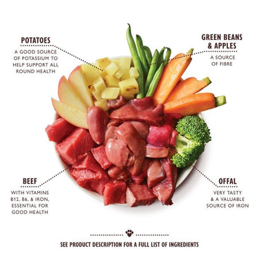 Technical Specifications:• Type: Wet Dog Food• Weight: 400g• Main Ingredients: Fresh beef, vegetables, and fruit• Dietary Information: Grain-free, nutritionally complete• Suitable For: Adult dogs